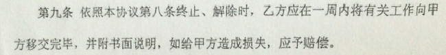 首先,根据第八条,合同只能由甲方解除;其次根据第九条,解除时乙方应在一个周内滚蛋,还要给甲方书面的说明(要说明啥?不是甲方要我走的吗?),还要赔偿。